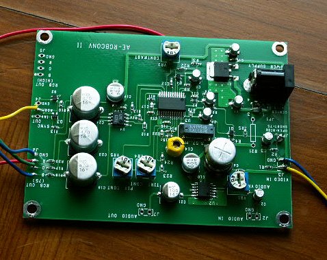 ・秋月電子通商のビデオ→RGBコンバータユニット(完成品)に配線をハンダ付けした所。