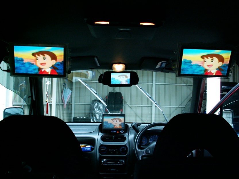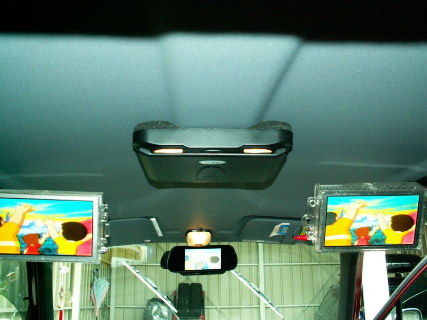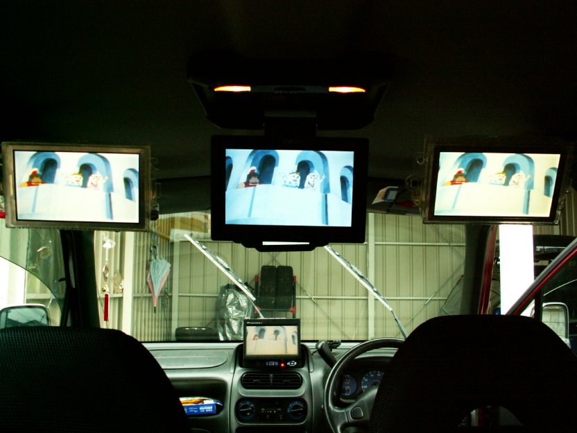 ・後ろから見たところ。後部の左右にある液晶ですが取付位置を変更しました。以前の取付だと目と画面の距離が近すぎたのでケンウッドのオプションパーツにて移動しました。