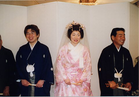 ・平成15年5月24日、大洲市にある、”マリエール大洲”にて梶原家・三好家 の結婚式がありました。父が出席予定でしたが、体調不良で、自分が代役で 出席してきました。新婦とは保育園時代からの同級生です。本当におめでとう ございます。