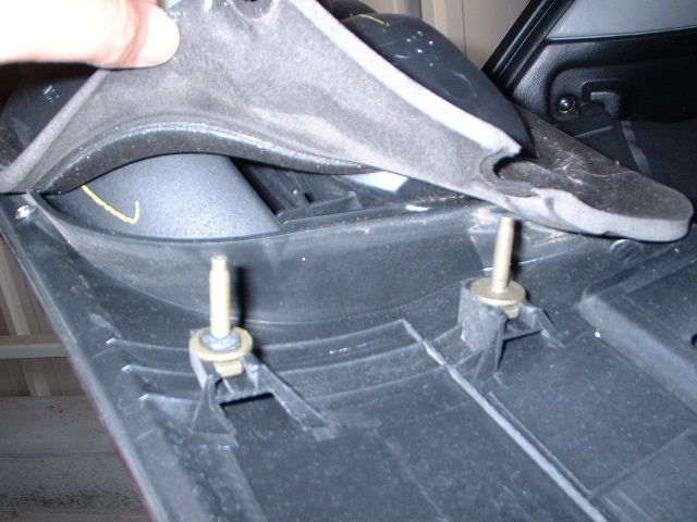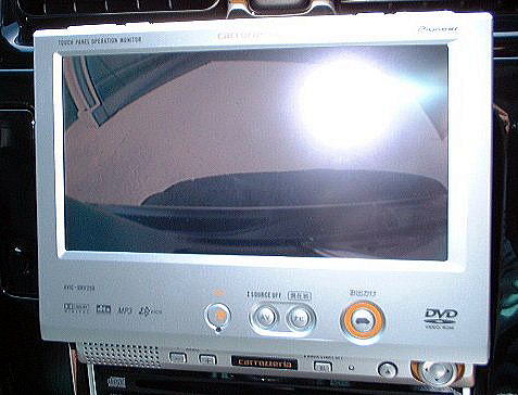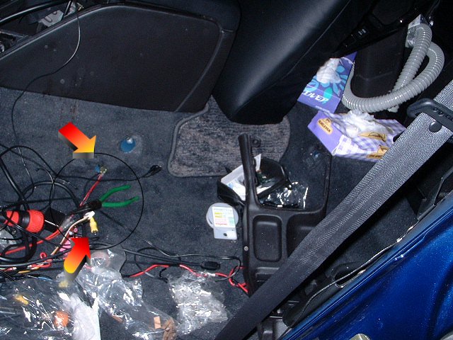 ・その後、内装をはがしてコードをはわせました。作業に夢中になって、撮影を忘れてしまいました・・・。申し訳ない。あるのは下の画像のみ。ナビの部品を助手席の下にセットするため、バックモニターのピンケーブルを内張りの下をはわせて矢印の部分に引っ張り出しました。