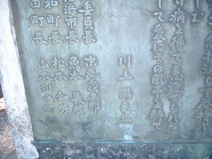 銅像の下の石盤(中央に書かれている”川上満亀(まんき)なんやら”とあるのは