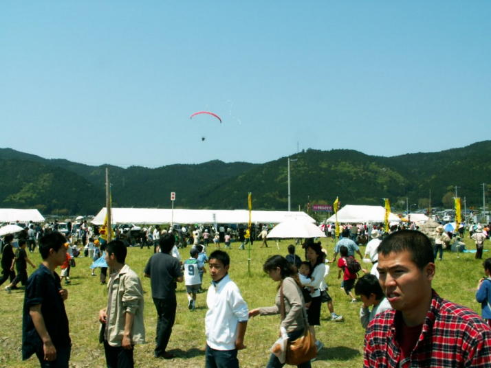 ・空を飛んでるエンジン付パラグライダーから”お菓子まき”がありました。でも、お菓子の量が少なすぎ!残念!