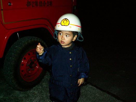 平成16年12月30日 消防団のヘルメットを借りてご満悦です。
