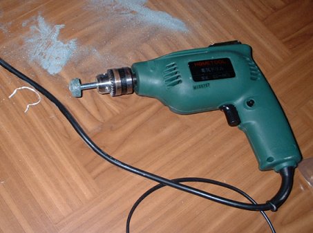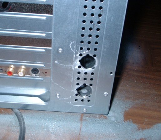 ・水冷のチューブを外に出すための穴です。説明書には16ミリとありました。でも、手持ちのドリルは6.5ミリが最大!手持ちの電動ドリルは10ミリまでのドリルしか合いません・・・。ホームセンターでドリルを見たら1500円します。一生使わないであろうサイズに1500円を払うのもなんですので、電動ドリルに取り付ける円錐(すい)形のサンダを買いました。これなら350円でした。でも、滑ってケースに傷は付くし、サンダの削りカスは出るしで大変でした。